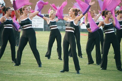 The Jacksonville State University Marching Southerners perform during a Fall 2000 performance, possibly a band exhibition performance at Tuscaloosa County High School in Northport, AL. The 2000 show title was "A Night in Birdland." Opener was "Birdland," the ballerina tune was "Night in Tunisia/Harlem Nocturne," and the closer was "Strawberry Soup." The band was under the direction of Kenneth G. Bodiford. Shown are ballerinas. (before October 2000)