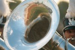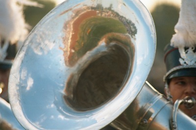 The Jacksonville State University Marching Southerners perform during a Fall 2000 performance, possibly a band exhibition performance at Tuscaloosa County High School in Northport, AL. The 2000 show title was "A Night in Birdland." Opener was "Birdland," the ballerina tune was "Night in Tunisia/Harlem Nocturne," and the closer was "Strawberry Soup." The band was under the direction of Kenneth G. Bodiford. Shown are 20Js. (before October 2000)