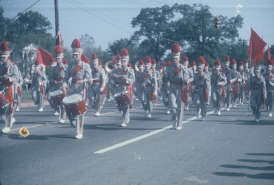 The Jacksonville State College (now Jacksonville State University) Southerners Marching band are shown in uniform during a parade, possibly the homecoming parade held October 6, 1962. (circa October 6, 1962) [courtesy of Joe David Walters]