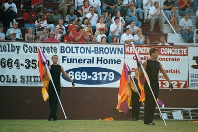 The Jacksonville State University Marching Southerners perform during a Fall 2000 performance, possibly a band exhibition performance at Tuscaloosa County High School in Northport, AL. The 2000 show title was "A Night in Birdland." Opener was "Birdland," the ballerina tune was "Night in Tunisia/Harlem Nocturne," and the closer was "Strawberry Soup." The band was under the direction of Kenneth G. Bodiford. Shown are color guard members. (before October 2000)