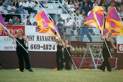 The Jacksonville State University Marching Southerners perform during a Fall 2000 performance, possibly a band exhibition performance at Tuscaloosa County High School in Northport, AL. The 2000 show title was "A Night in Birdland." Opener was "Birdland," the ballerina tune was "Night in Tunisia/Harlem Nocturne," and the closer was "Strawberry Soup." The band was under the direction of Kenneth G. Bodiford. Shown are color guard members. (before October 2000)