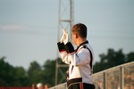 The Jacksonville State University Marching Southerners perform during a Fall 2000 performance, possibly a band exhibition performance at Tuscaloosa County High School in Northport, AL. The 2000 show title was "A Night in Birdland." Opener was "Birdland," the ballerina tune was "Night in Tunisia/Harlem Nocturne," and the closer was "Strawberry Soup." The band was under the direction of Kenneth G. Bodiford. Shown is a drum major. (before October 2000)