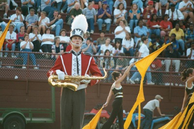 The Jacksonville State University Marching Southerners perform during a Fall 2000 performance, possibly a band exhibition performance at Tuscaloosa County High School in Northport, AL. The 2000 show title was "A Night in Birdland." Opener was "Birdland," the ballerina tune was "Night in Tunisia/Harlem Nocturne," and the closer was "Strawberry Soup." The band was under the direction of Kenneth G. Bodiford. (before October 2000)