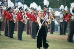 The Jacksonville State University Marching Southerners perform during a Fall 2000 performance, possibly a band exhibition performance at Tuscaloosa County High School in Northport, AL. The 2000 show title was "A Night in Birdland." Opener was "Birdland," the ballerina tune was "Night in Tunisia/Harlem Nocturne," and the closer was "Strawberry Soup." The band was under the direction of Kenneth G. Bodiford. (before October 2000)