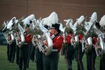 The Jacksonville State University Marching Southerners perform during a Fall 2000 performance, possibly a band exhibition performance at Tuscaloosa County High School in Northport, AL. The 2000 show title was "A Night in Birdland." Opener was "Birdland," the ballerina tune was "Night in Tunisia/Harlem Nocturne," and the closer was "Strawberry Soup." The band was under the direction of Kenneth G. Bodiford. Shown are 20Js. (before October 2000)