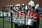 The Jacksonville State University Marching Southerners perform during a Fall 2000 performance, possibly a band exhibition performance at Tuscaloosa County High School in Northport, AL. The 2000 show title was "A Night in Birdland." Opener was "Birdland," the ballerina tune was "Night in Tunisia/Harlem Nocturne," and the closer was "Strawberry Soup." The band was under the direction of Kenneth G. Bodiford. Shown are members of the drumline. (before October 2000)