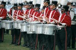 The Jacksonville State University Marching Southerners perform during a Fall 2000 performance, possibly a band exhibition performance at Tuscaloosa County High School in Northport, AL. The 2000 show title was "A Night in Birdland." Opener was "Birdland," the ballerina tune was "Night in Tunisia/Harlem Nocturne," and the closer was "Strawberry Soup." The band was under the direction of Kenneth G. Bodiford. Shown are members of the drumline. (before October 2000)