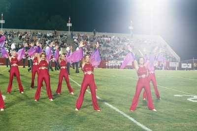 The Jacksonville State University Marching Southerners perform during a Fall 2000 performance, possibly the September 21 football game held in the Paul Snow Stadium in Jacksonville, AL against Samford. The 2000 show title was "A Night in Birdland." Opener was "Birdland," the ballerina tune was "Night in Tunisia/Harlem Nocturne," and the closer was "Strawberry Soup." The band was under the direction of Kenneth G. Bodiford. (circa September 21, 2000)