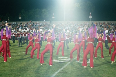 The Jacksonville State University Marching Southerners perform during a Fall 2000 performance, possibly the September 21 football game held in the Paul Snow Stadium in Jacksonville, AL against Samford. The 2000 show title was "A Night in Birdland." Opener was "Birdland," the ballerina tune was "Night in Tunisia/Harlem Nocturne," and the closer was "Strawberry Soup." The band was under the direction of Kenneth G. Bodiford. (circa September 21, 2000)