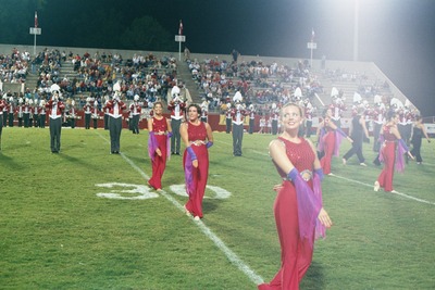 The Jacksonville State University Marching Southerners perform during a Fall 2000 performance, possibly the September 21 football game held in the Paul Snow Stadium in Jacksonville, AL against Samford. The 2000 show title was "A Night in Birdland." Opener was "Birdland," the ballerina tune was "Night in Tunisia/Harlem Nocturne," and the closer was "Strawberry Soup." The band was under the direction of Kenneth G. Bodiford. (circa September 21, 2000)