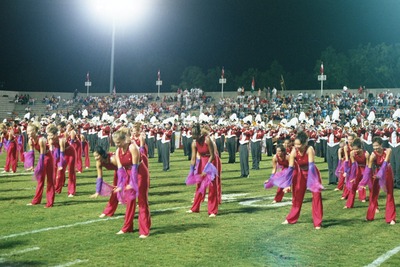 The Jacksonville State University Marching Southerners perform during a Fall 2000 performance, possibly the September 21 football game held in the Paul Snow Stadium in Jacksonville, AL against Samford. The 2000 show title was "A Night in Birdland." Opener was "Birdland," the ballerina tune was "Night in Tunisia/Harlem Nocturne," and the closer was "Strawberry Soup." The band was under the direction of Kenneth G. Bodiford. (circa September 21, 2000)