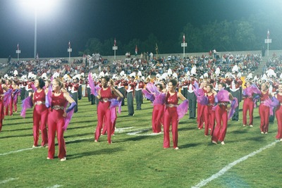 The Jacksonville State University Marching Southerners perform during a Fall 2000 performance, possibly the September 21 football game held in the Paul Snow Stadium in Jacksonville, AL against Samford. The 2000 show title was "A Night in Birdland." Opener was "Birdland," the ballerina tune was "Night in Tunisia/Harlem Nocturne," and the closer was "Strawberry Soup." The band was under the direction of Kenneth G. Bodiford. (circa September 21, 2000)