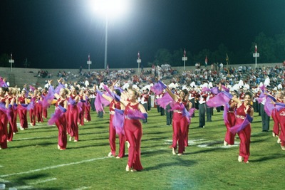 The Jacksonville State University Marching Southerners perform during a Fall 2000 performance, possibly the September 21 football game held in the Paul Snow Stadium in Jacksonville, AL against Samford. The 2000 show title was "A Night in Birdland." Opener was "Birdland," the ballerina tune was "Night in Tunisia/Harlem Nocturne," and the closer was "Strawberry Soup." The band was under the direction of Kenneth G. Bodiford. (circa September 21, 2000)