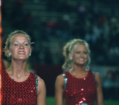 The Jacksonville State University Marching Southerners perform during a Fall 2000 performance, possibly the September 21 football game held in the Paul Snow Stadium in Jacksonville, AL against Samford. The 2000 show title was "A Night in Birdland." Opener was "Birdland," the ballerina tune was "Night in Tunisia/Harlem Nocturne," and the closer was "Strawberry Soup." The band was under the direction of Kenneth G. Bodiford. (circa September 21, 2000)