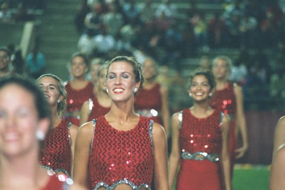 The Jacksonville State University Marching Southerners perform during a Fall 2000 performance, possibly the September 21 football game held in the Paul Snow Stadium in Jacksonville, AL against Samford. The 2000 show title was "A Night in Birdland." Opener was "Birdland," the ballerina tune was "Night in Tunisia/Harlem Nocturne," and the closer was "Strawberry Soup." The band was under the direction of Kenneth G. Bodiford. (circa September 21, 2000)