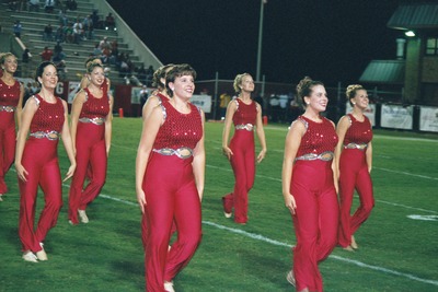 The Jacksonville State University Marching Southerners perform during a Fall 2000 performance, possibly the September 21 football game held in the Paul Snow Stadium in Jacksonville, AL against Samford. The 2000 show title was "A Night in Birdland." Opener was "Birdland," the ballerina tune was "Night in Tunisia/Harlem Nocturne," and the closer was "Strawberry Soup." The band was under the direction of Kenneth G. Bodiford. (circa September 21, 2000)