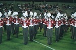 The Jacksonville State University Marching Southerners perform during a Fall 2000 performance, possibly the September 21 football game held in the Paul Snow Stadium in Jacksonville, AL against Samford. The 2000 show title was "A Night in Birdland." Opener was "Birdland," the ballerina tune was "Night in Tunisia/Harlem Nocturne," and the closer was "Strawberry Soup." The band was under the direction of Kenneth G. Bodiford. (circa September 21, 2000)