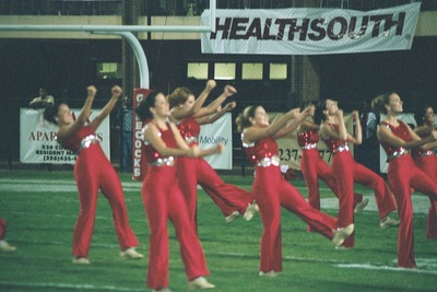 The Jacksonville State University Marching Southerners perform during a Fall 2000 performance, possibly the September 21 football game held in the Paul Snow Stadium in Jacksonville, AL against Samford. The 2000 show title was "A Night in Birdland." Opener was "Birdland," the ballerina tune was "Night in Tunisia/Harlem Nocturne," and the closer was "Strawberry Soup." The band was under the direction of Kenneth G. Bodiford. (circa September 21, 2000)