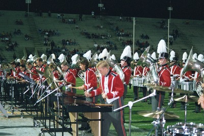 The Jacksonville State University Marching Southerners perform during a Fall 2000 performance, possibly the September 21 football game held in the Paul Snow Stadium in Jacksonville, AL against Samford. The 2000 show title was "A Night in Birdland." Opener was "Birdland," the ballerina tune was "Night in Tunisia/Harlem Nocturne," and the closer was "Strawberry Soup." The band was under the direction of Kenneth G. Bodiford. (circa September 21, 2000)