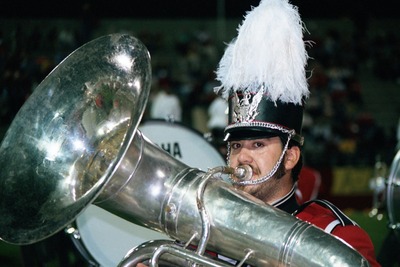 The Jacksonville State University Marching Southerners perform during a Fall 2000 performance, possibly the September 21 football game held in the Paul Snow Stadium in Jacksonville, AL against Samford. The 2000 show title was "A Night in Birdland." Opener was "Birdland," the ballerina tune was "Night in Tunisia/Harlem Nocturne," and the closer was "Strawberry Soup." The band was under the direction of Kenneth G. Bodiford. (circa September 21, 2000)