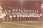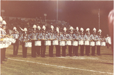 A drumline performs on the field at Jacksonville State University, possibly members of Spirit of Atlanta Drum and Bugle Corps. (circa 1990s)