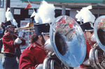 Members of the Jacksonville State University Marching Southerners march down Highway 21 in a parade through Jacksonville, Alabama. The band was under the direction of Dr. Scott McBride and the field direction of drum majors Keith Casey and Marcus LeGear. (circa 1991)