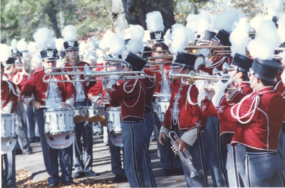 Members of the Jacksonville State University Marching Southerners march down Highway 21 in a parade through Jacksonville, Alabama. The band was under the direction of Dr. Scott McBride and the field direction of drum majors Keith Casey and Marcus LeGear. (circa 1991)