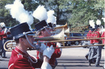 Members of the Jacksonville State University Marching Southerners march down Highway 21 in a parade through Jacksonville, Alabama. The band was under the direction of Dr. Scott McBride and the field direction of drum majors Keith Casey and Marcus LeGear. (circa 1991)