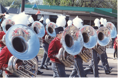 Members of the Jacksonville State University Marching Southerners march down Highway 21 in a parade through Jacksonville, Alabama. The band was under the direction of Dr. Scott McBride and the field direction of drum majors Keith Casey and Marcus LeGear. (circa 1991)