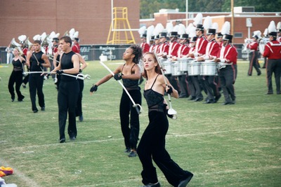 The Jacksonville State University Marching Southerners perform during a Fall 2000 performance, possibly a band exhibition performance at Tuscaloosa County High School in Northport, AL. The 2000 show title was "A Night in Birdland." Opener was "Birdland," the ballerina tune was "Night in Tunisia/Harlem Nocturne," and the closer was "Strawberry Soup." The band was under the direction of Kenneth G. Bodiford. Shown are rifles, 20Js, and drumline members. (before October 2000)