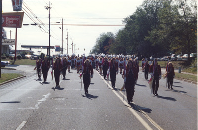 Members of the Jacksonville State University Marching Southerners march down Highway 21 in a parade through Jacksonville, Alabama. The band was under the direction of Dr. Scott McBride and the field direction of drum majors Keith Casey and Marcus LeGear. (circa 1991)