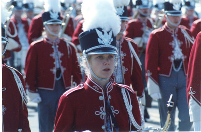 Members of the Jacksonville State University Marching Southerners march down Highway 21 in a parade through Jacksonville, Alabama. The band was under the direction of Dr. Scott McBride and the field direction of drum majors Keith Casey and Marcus LeGear. (circa 1991)