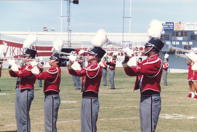 The Jacksonville State University Marching Southerners perform during a 1991 performance in the A. B. Sonny Martin Stadium at Lowndes High School in Valdosta, GA. The 1991 show was titled "West Side Story." The band was under the direction of Dr. Scott McBride and the field direction of drum majors Keith Casey and Marcus LeGear. (circa 1991)