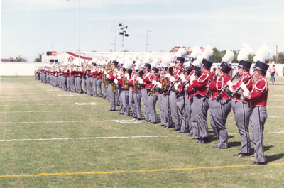 The Jacksonville State University Marching Southerners perform during a 1991 performance in the A. B. Sonny Martin Stadium at Lowndes High School in Valdosta, GA. The 1991 show was titled "West Side Story." The band was under the direction of Dr. Scott McBride and the field direction of drum majors Keith Casey and Marcus LeGear. (circa 1991)