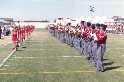 The Jacksonville State University Marching Southerners perform during a 1991 performance in the A. B. Sonny Martin Stadium at Lowndes High School in Valdosta, GA. The 1991 show was titled "West Side Story." The band was under the direction of Dr. Scott McBride and the field direction of drum majors Keith Casey and Marcus LeGear. (circa 1991)