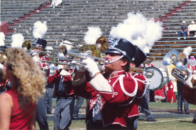 The Jacksonville State University Marching Southerners perform during a 1991 performance in the A. B. Sonny Martin Stadium at Lowndes High School in Valdosta, GA. The 1991 show was titled "West Side Story." The band was under the direction of Dr. Scott McBride and the field direction of drum majors Keith Casey and Marcus LeGear. (circa 1991)