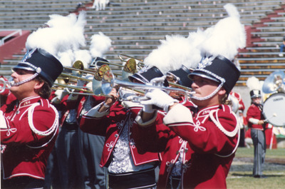 The Jacksonville State University Marching Southerners perform during a 1991 performance in the A. B. Sonny Martin Stadium at Lowndes High School in Valdosta, GA. The 1991 show was titled "West Side Story." The band was under the direction of Dr. Scott McBride and the field direction of drum majors Keith Casey and Marcus LeGear. (circa 1991)