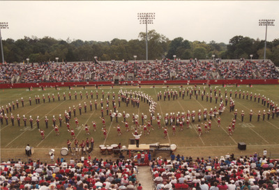 The Jacksonville State University Marching Southerners and Ballerinas perform during a 1991 performance in the Paul Snow Stadium in Jacksonville, AL. The 1991 show was titled "West Side Story." The band was under the direction of Dr. Scott McBride and the field direction of drum majors Keith Casey and Marcus LeGear. (circa 1991)