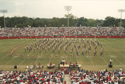 The Jacksonville State University Marching Southerners and Ballerinas perform during a 1991 performance in the Paul Snow Stadium in Jacksonville, AL. The 1991 show was titled "West Side Story." The band was under the direction of Dr. Scott McBride and the field direction of drum majors Keith Casey and Marcus LeGear. (circa 1991)