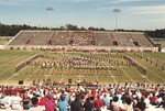 The Jacksonville State University Marching Southerners perform during a Fall 1991 performance, possibly a band exhibition performance at a high school. The 1991 show was titled "West Side Story." The band was under the direction of Dr. Scott McBride and the field direction of drum majors Keith Casey and Marcus LeGear. (circa Fall 1991)