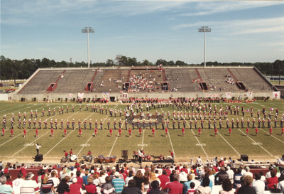 The Jacksonville State University Marching Southerners perform during a Fall 1991 performance, possibly a band exhibition performance at a high school. The 1991 show was titled "West Side Story." The band was under the direction of Dr. Scott McBride and the field direction of drum majors Keith Casey and Marcus LeGear. (circa Fall 1991)