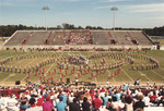 The Jacksonville State University Marching Southerners perform during a Fall 1991 performance, possibly a band exhibition performance at a high school. The 1991 show was titled "West Side Story." The band was under the direction of Dr. Scott McBride and the field direction of drum majors Keith Casey and Marcus LeGear. (circa Fall 1991)