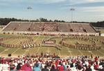 The Jacksonville State University Marching Southerners perform during a Fall 1991 performance, possibly a band exhibition performance at a high school. The 1991 show was titled "West Side Story." The band was under the direction of Dr. Scott McBride and the field direction of drum majors Keith Casey and Marcus LeGear. (circa Fall 1991)
