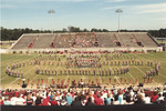 The Jacksonville State University Marching Southerners perform during a Fall 1991 performance, possibly a band exhibition performance at a high school. The 1991 show was titled "West Side Story." The band was under the direction of Dr. Scott McBride and the field direction of drum majors Keith Casey and Marcus LeGear. (circa Fall 1991)
