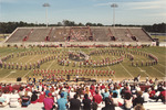 The Jacksonville State University Marching Southerners perform during a Fall 1991 performance, possibly a band exhibition performance at a high school. The 1991 show was titled "West Side Story." The band was under the direction of Dr. Scott McBride and the field direction of drum majors Keith Casey and Marcus LeGear. (circa Fall 1991)