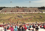 The Jacksonville State University Marching Southerners perform during a Fall 1991 performance, possibly a band exhibition performance at a high school. The 1991 show was titled "West Side Story." The band was under the direction of Dr. Scott McBride and the field direction of drum majors Keith Casey and Marcus LeGear. (circa Fall 1991)