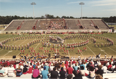 The Jacksonville State University Marching Southerners perform during a Fall 1991 performance, possibly a band exhibition performance at a high school. The 1991 show was titled "West Side Story." The band was under the direction of Dr. Scott McBride and the field direction of drum majors Keith Casey and Marcus LeGear. (circa Fall 1991)