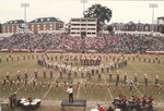 The Jacksonville State University Marching Southerners and Ballerinas perform during a 1992 performance in the Paul Snow Stadium in Jacksonville, AL. The 1992 show featured "Channel One Suite," "La Suerte de Los Tontos" from Cuban Fire Suite, and "Variations on a Shaker Melody" from Appalachian Spring. The band was under the direction of Dr. Scott McBride and the field direction of drum major Chad Hannah. (circa Fall 1992)