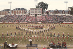 The Jacksonville State University Marching Southerners and Ballerinas perform during a 1992 performance in the Paul Snow Stadium in Jacksonville, AL. The 1992 show featured "Channel One Suite," "La Suerte de Los Tontos" from Cuban Fire Suite, and "Variations on a Shaker Melody" from Appalachian Spring. The band was under the direction of Dr. Scott McBride and the field direction of drum major Chad Hannah. (circa Fall 1992)