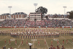 The Jacksonville State University Marching Southerners and Ballerinas perform during a 1992 performance in the Paul Snow Stadium in Jacksonville, AL. The 1992 show featured "Channel One Suite," "La Suerte de Los Tontos" from Cuban Fire Suite, and "Variations on a Shaker Melody" from Appalachian Spring. The band was under the direction of Dr. Scott McBride and the field direction of drum major Chad Hannah. (circa Fall 1992)